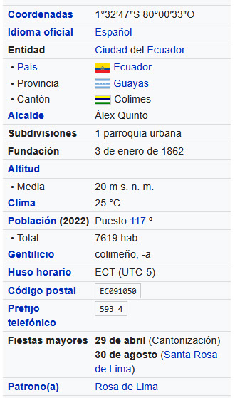 Colimes, también conocida como Santa Rosa de Colimes, es una ciudad ecuatoriana que forma parte de la Provincia de Guayas. Se encuentra en la zona costera de Ecuador, justo donde el río Colimes se une con el río Daule. Según el censo de 2022, Colimes tenía 26.251 habitantes, de estos el 51,2 % son hombres y el 48,8 % mujeres, esto la convierte en una de las ciudades más pobladas del país.